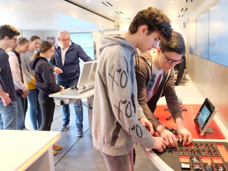 Im Rahmen der Berufsorientierung kam am 19.-21.2.2019 der ME-Infotruck an unsere Schule. Kernstück des zweistöckigen Trucks ist eine interaktive Ausstellung über die Anforderungen der Berufswelt in der Metall- und Elektroindustrie (mehr). An verschiedenen Experimentierstationen konnten die Schülerinnen und Schüler der 9. und 10. Jahrgangsstufe erfahren, wie eine CNC-Fräse programmiert wird, ein Wechselschalter in elektronischen Schaltungen eingesetzt werden kann oder wie ein Aufzug gesteuert wird.