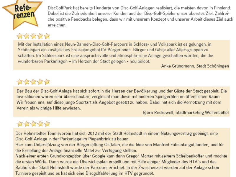 Aus den Referenzen von DiscGolfPark, einer Firma, die DG-Anlagen europaweit errichtet.