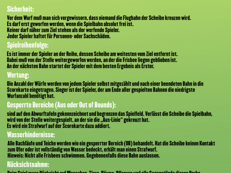 Beim Spiel muss Rücksicht auf Menschen, Tiere, Bäume, Pflanzen und andere Gegenstände dieses Parks genommen werden. Haltet den Parcours sauber!