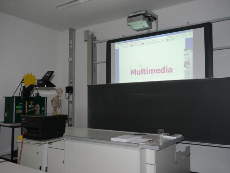 Die technische Ausrüstung ist auf dem neuesten Stand: Selbstverständlich ist jeder Fachraum neben Tageslichtprojektoren auch mit Beamer, Laptop und Aktiv-Lautsprechern ausgestattet. In einem der Säle wurde ein interaktives Whiteboard angebracht, das zusammen mit einer geschickt schwenkbaren klassischen Tafel eine Fülle von medialen Möglichkeiten bietet. So ist ein „fliegender” Wechsel von der Multimedia-Anwendung zur gewohnten Kreide-Schreibfläche möglich.