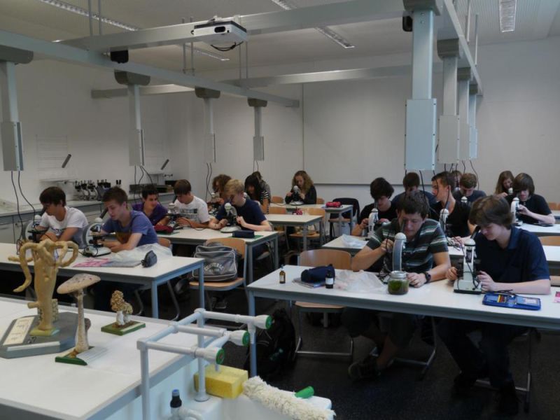 Seit Mai 2011 befinden sich die drei Biologie-Fachräume im neu errichteten Erweiterungsbau. Die hellen Möbeloberflächen und die großen Fenster sorgen für angenehm belichtete Räume, eine gut steuerbare Jalousien-Anlage erlaubt eine ausgewogene Lichtdosierung in den laublosen Zeiten. Denn ab dem Frühjahr übernimmt der schöne alte Baumbestand, der dank umsichtiger Planung erhalten blieb, die schattenspendende Funktion. Zudem stellt das angenehme Grün der großen Baumkronen einen wichtigen Wohlfühlfaktor dar.