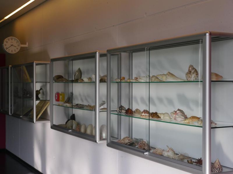 Vier große elegante Glasvitrinen vor den Fachsälen bieten Raum für vielerlei Ausstellungsmaterial wie etwa für unsere erlesene Molluskensammlung. Dabei handelt es sich um eine sehr umfangreiche Kollektion von Schalen und Gehäusen von Weichtieren, also Schnecken, Muscheln und Tintenfischen. Die Exponate reichen von nur fingernagelgroßen bis zu 20 cm und mehr messenden, oftmals bizarr geformten Kalkgebilden. Einen Höhepunkt stellen dabei die seltenen, ausgesprochen ästhetischen Schalen der Nautiliden oder Perlboote dar, deren Heimat der Pazifik ist und die als heute noch lebende schalentragende Verwandte der vor allem aus dem Jura bekannten fossilen Ammoniten gelten.