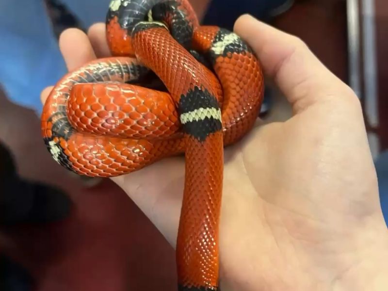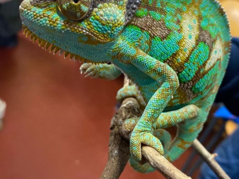 Bei den Reptilien stellt Herr Werdan uns seine Mini-Schildkröten, ein Chamäleon und etliche Schlangen vor. Beispielsweise hatte er seine (ungiftige) Königsnatter dabei, die der hochgiftigen Korallenschlange sehr ähnlich sieht. Beide haben Ringe in den Farben schwarz, rot und weiß, aber die Reihenfolge ist eine andere. Als Merkspruch brachte er uns Schülern folgendes bei: „Folgt weiß auf rot – das bringt den Tod“.