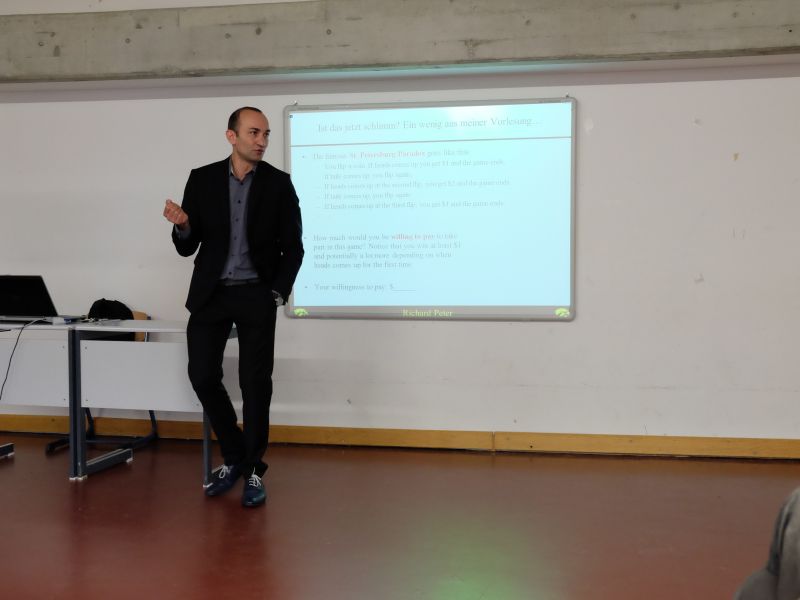 Am 17. Juni besuchte uns Prof. Dr. Richard Peter, der 2004 vom Katharinen-Gymnasium den Sprung ans Maximilianeum schaffte und an der LMU München Mathematik studierte. Nach seiner Promotion wurde er schon im Alter von 29 Jahren Juniorprofessor an der LMU, inzwischen lebt er in den USA und ist Assistant Professor am Department of Finance der Universität Iowa. Ein Schwerpunkt seiner Forschungen liegt im Risikomanagement. Darunter versteht man sämtliche Maßnahmen zur systematischen Erkennung, Analyse, Bewertung, Überwachung und Kontrolle von Risiken. Um das Thema Risiko ging es auch bei seinem Vortrag „Zwo, Eins, Risiko – Entscheidungsverhalten unter Unsicherheit, ein mathematisches Problem?” In wichtigen Bereichen der angewandten Mathematik spielt Risiko eine zentrale Rolle, z.B. in der Statistik und in der Finanzmathematik (Kapitalmarkttheorie, Modellierung von Zinsen). Auch in anderen Bereichen ist Risiko von Bedeutung, etwa in den Wirtschaftswissenschaften (unternehmerisches Risiko), der Entscheidungstheorie (Einfluss von Risiko auf Entscheidungsverhalten) und in der Psychologie (Risikowahrnehmung). Bereits das erste Beispiel, das berühmte St. Petersburg–Paradoxon, war sehr interessant und lehrreich. Hier geht es um ein Spiel, bei dem eine Münze geworfen wird. Ist das Ergebnis beim 1. Wurf „Kopf”, so erhält der Spieler 1 € und das Spiel ist beendet. Falls nicht, wird nochmals geworfen. Erscheint nun „Kopf”, gibt es 2 € und das Spiel ist aus. Ansonsten wird wieder geworfen und bei „Kopf” werden 4 € ausbezahlt. Bei „Zahl” wird die Münze wieder geworfen und als Gewinn winken 8 €, dann 16 € usw. Der Referent fragte, welchen Betrag die Zuhörer bei einem solchen Spiel als Einsatz leisten wollten. Bei dem Spiel können Millionen von Euro gewonnen werden, allerdings mit einer winzigen Wahrscheinlichkeit. Fällt z.B. erst nach 25 Würfen „Kopf”, so ist der Gewinn 224, das sind fast 17 Millionen. Die Wahrscheinlichkeit dafür ist mit 0,525 sehr klein (etwa 0,00000003). Erfahrungsgemäß würde kaum jemand mehr als 10 € Einsatz riskieren, obwohl der Erwartungswert des Gewinns unendlich groß ist.