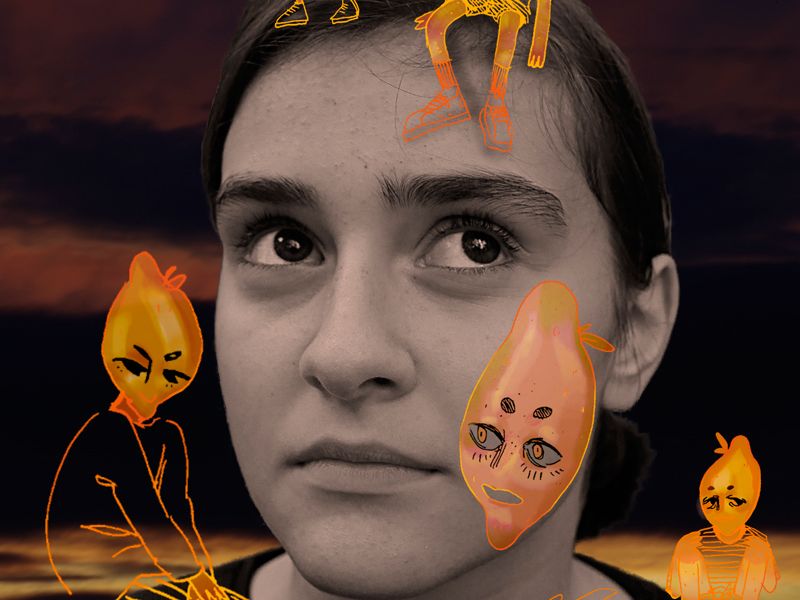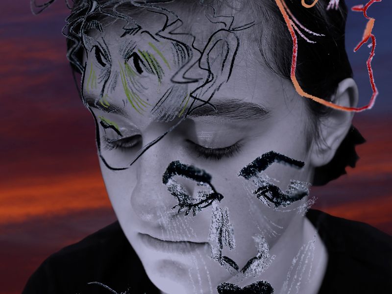 Bei Elenas Einzelarbeit mit dem Titel “Zwischen Traum und Realität” handelt es sich um eine Bilderserie mit sechs Porträts - eine Kombination zweier Welten, sowohl inhaltlich als auch formal: Hier stehen sich parallel Zeichnung und Fotografie sowie Traum und Realität gegenüber. Bei der digitalen Überarbeitungen erarbeitete sie gezielt Brüche und eine fremde surreale Atmosphäre, die vom Spannungsfeld der verschiedenen Darstellungsweisen geprägt ist. Das Zusammenspiel von Himmelsaufnahme, der Mimik und Gestik des Porträts und der Zeichnung ist einerseits als eine äußere Ansicht der abgebildeten Person, andererseits aber auch als eine Art „inneres Bild“ von ihr zu sehen: ein Bild zwischen Traum und Realität.
