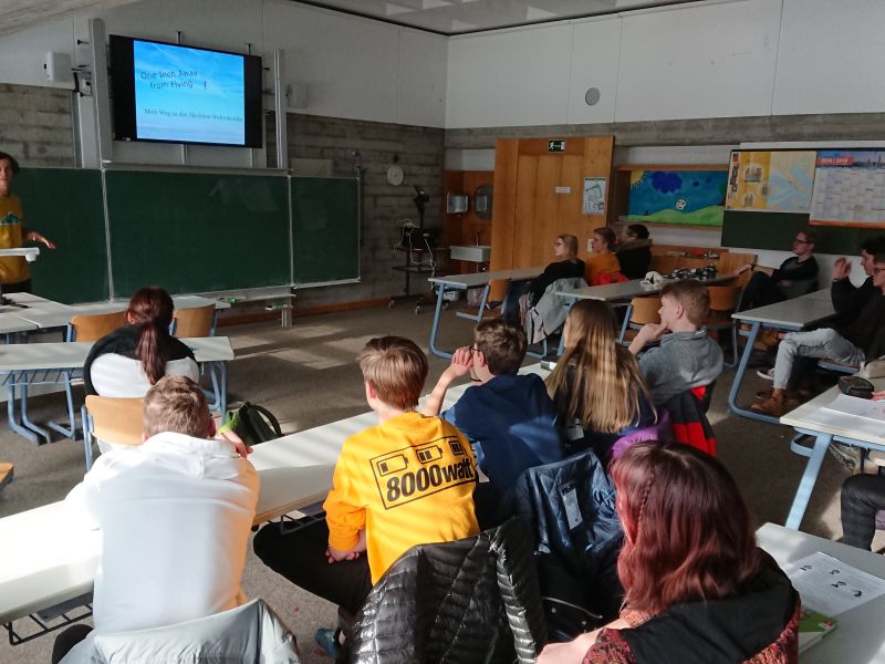 In einer Mischung aus Vortrag und Workshop gibt er im P–Seminar Alpencross Einblicke in sein Metier und vermittelt den Teilnehmern äußerst eindrücklich, dass eine Sammlung aufregender Filmsequenzen, gute Musik und technisches Knowhow beim Filmschnitt bei Weitem nicht reicht, um eine packende Dokumentation der geplanten Alpenüberquerung zu drehen. Eine klare Struktur muss her, Interviews, Perspektivenwechsel und vor allem eine Geschichte, die der Film erzählen soll. Zutaten, die unabdingbar sind und die Vorarbeit erfordern. „Nimm die schwere Kamera mit – es lohnt sich!” Nur gute Bilder liefern einen guten Film. „Denkt bei jeder Einstellung daran, wie es später im Endprodukt aussehen, wie es wirken soll!” Die Geschichte muss der Kameramann beim Filmen schon im Kopf haben. „Die besten Szenen einzufangen ist Anstrengung pur! Wer die Ankunft am Berg filmen will, der muss vorneweg radeln!” Es gelingt Valentin Rapp, nicht nur zu beschreiben, wie man gute Filme macht. Er weckt Neugier und Lust darauf, sofort anzufangen. Die ersten Ideen sind schon im Kopf, Szenen, die erst noch zu filmen sind, spielen sich schon vor dem geistigen Auge der Seminarteilnehmer ab, Pointen und Lacher werden geplant. Bis zur Fahrt im September sind es noch ein paar Monate – der Film beginnt aber schon hier und heute! Wir danken Valentin Rapp für sein Engagement und seine Hilfe. Seine außergewöhnlichen Filme kann man sich unter valentinrapp.blogspot.de ansehen.