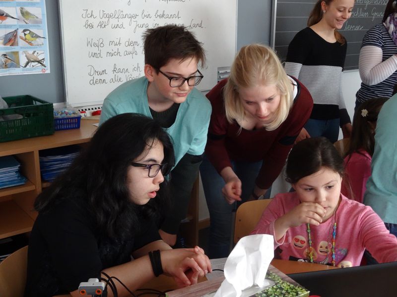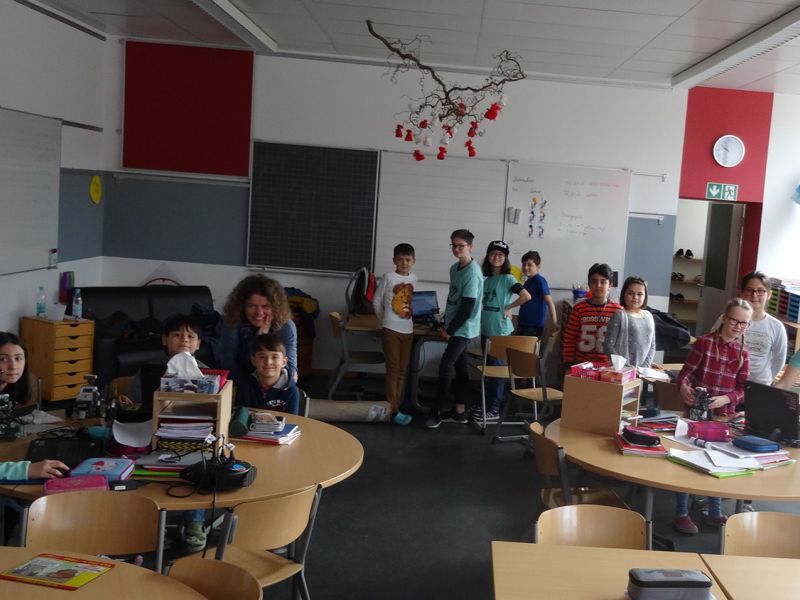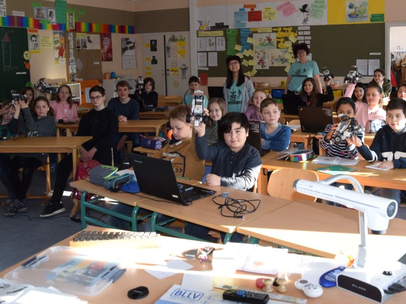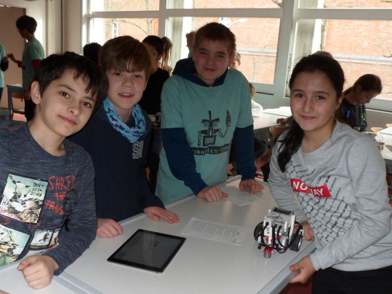 Am 21.03.2017 stand der zweite Außentermin für die Robotics Gruppe um Frau Schrodt auf dem Plan – dieses Mal ging es in Ingolstadts Osten in die Lessingstraße. Die Klasse 4a wurde in zwei Gruppen eingeteilt, und danach hieß es: programmieren, ausprobieren, verzweifeln, freuen, an die Wand fahren oder auch vor der Wand stehen bleiben. Diese Klasse arbeitet eng mit dem Caritas Zentrum St. Vinzenz zusammen. Alle freuten sich darüber, dass ihr Roboter Töne von sich gab und auf sie zufuhr.