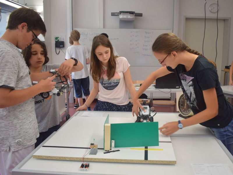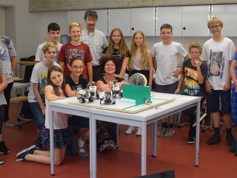 Am 10. Juli 2017 kamen drei Gruppen vom Reuchlin-Gymnasium unter der Leitung von Herrn Burzler zu uns an die Schule. In einem kleinen Wettbewerb konnten die Anfänger aus der 6. Klasse ihr Wissen anwenden und unter Beweis stellen. Dabei sollte der programmierte Roboter, auf einem Spielfeld einer schwarzen Linie folgen und danach ein Hindernis zur Seite zu schieben. Dies löste dann ein Signallicht aus und man konnte ins Ziel einfahren. Vier Roboter kamen dort auch an, so dass schließlich die beste gemessene Zeit einer Mädchengruppe vom Reuchlin den Sieg bescherte.
