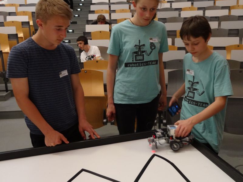 Am 06. Mai durften neun Schüler der 7. und 8. Klassen dorthin fahren und einen spannenden Tag mit dem Programmieren ihres EV3 verbringen. Bereits zum vierten Mal nahm das Katherl an diesem Wettbewerb teil, bei dem es vor allem darum geht, möglichst schnell einer schwarzen Linie zu folgen. In diesem Jahr hatte sich das Organisationsteam etwas ganz Besonderes einfallen lassen – es war ein kleiner Jahrmarkt mit Pommesbude, Geisterbahn und Autoscooter aufgebaut. Beim Überraschungshindernis musste erst ein Licht ausgelöst und die Schranke zum Autoscooter geöffnet werden. Dieses Hindernis stellte für unsere Gruppen „Robocops” und „Alphalamas” kein Problem dar. Vor allem die Siebtklässler konnten mit ihrem Platz in der ersten Hälfte (bei 31 Gruppen) durchaus zufrieden sein.