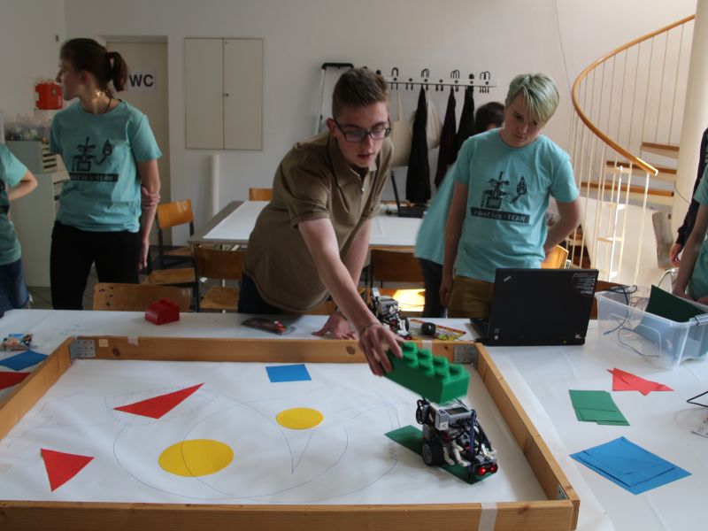 Ab der 6. Klasse kann das Wahlfach Robotics gewählt werden und bietet bis zur 10. Klasse viele Möglichkeiten sich intensiv mit Robotern, Legoaufbauten und Informatik zu beschäftigen. Zuerst wird ein Roboter aus Legoteilen aufgebaut. Anschließend programmieren die Schüler und Schülerinnen „ihren“ EV3 und lernen so spielerisch die wichtigsten Elemente der Informatik kennen. Während die Anfängergruppe noch die verschiedenen Sensoren zuerst einzeln und dann zusammen ausprobiert und erforscht, lernen die Fortgeschrittenen schon Schleifen, Schalter und komplexere Aufgabenstellungen kennen. So müssen sie beispielsweise zusammenarbeiten und gemeinsam einen Parcours durchfahren. Kreativität, Teamwork, Ideenreichtum, problemlösendes Denken, aber auch Spaß und kollegiales Verhalten (schließlich soll in den Zwei- bis Dreiergruppen jeder einmal basteln, programmieren oder den EV3 bedienen dürfen) können in diesem Wahlfach in der Praxis eingeübt werden.