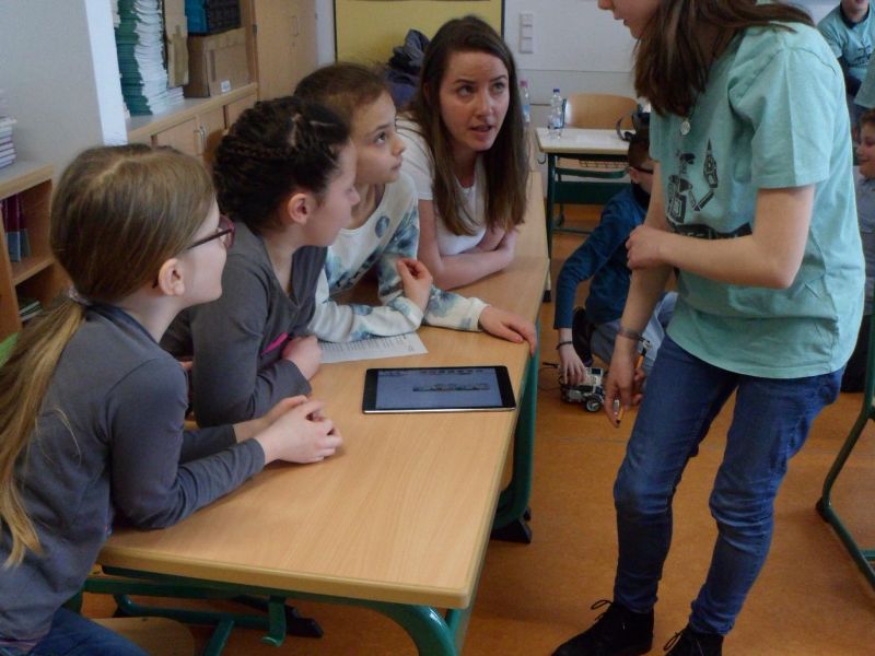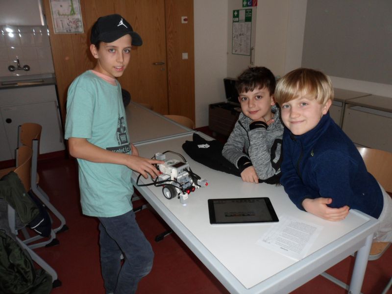Eine Stunde lang dürfen die Kinder dabei den Roboter programmieren und testen, Kurven fahren, Hindernissen ausweichen und Lieder aufnehmen, die der EV3 dann abspielt. Dieses Jahr verwendete die Gruppe erstmals eine App auf den IPADs. Das entspannt die Situation enorm, denn nun können die Schüler direkt am Boden die EV3s ausprobieren, zudem stolpern sie nicht mehr über die Netzgeräte der Computer. Für die Grundschüler ist diese Stunde eine schöne Abwechslung zu ihren gerade sehr stressigen Stunden mit vielen Proben, für die Wahlfachschüler ist es eine gute Möglichkeit, ihr Wissen anderen beizubringen. Deswegen werden wir auch sicher nächstes Jahr mancher Grundschule einen Besuch abstatten bzw. ans Katherl einladen.