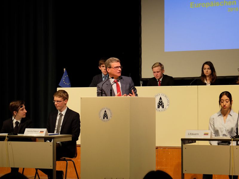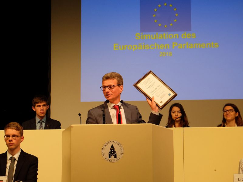 Bereits zum 15. Mal fand am Do., den 19.4.2018 eine Simulation einer Sitzung des Europäischen Parlaments am Katherl statt. Als Ehrengäste durften wir Kultusminister Bernd Sibler und den Oberbürgermeister Ingolstadts, Dr. Christian Lösel, begrüßen. Zur Eröffnung der Sitzung betonte der Kultusminister: „Das Simulationsspiel zum Europäischen Parlament ist in vielerlei Hinsicht ein bemerkenswertes Beispiel für politische Bildung an Bayerns Schulen: Unsere Schülerinnen und Schüler können unmittelbar erleben, wie Politik in Europa funktioniert. Sie erhalten einen Einblick in die Fülle an Themen, die auf europäischer Ebene verhandelt werden. Das Projekt bietet die Chance, sich der Bedeutung Europas und demokratischer Prozesse bewusst zu werden. Das ist eine zentrale Voraussetzung, um deren hohen Wert zu erkennen und sich für ein demokratisches Miteinander einsetzen zu können”.