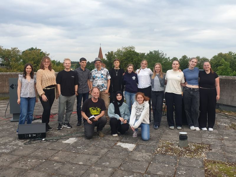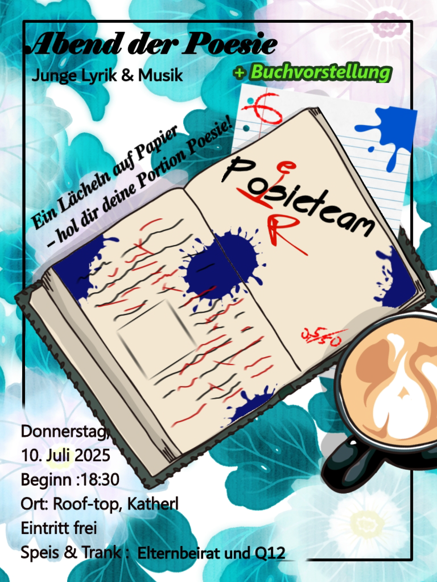 Am 10. Juli fand der traditionelle Abend der Poesie statt. Bei all den Lesungen unseres Dichter-Clubs auf diversen Bühnen über das Jahr ist es für uns als Poesieteam immer wieder etwas Besonderes, an unserer Schule, unserer „Base", aufzutreten. Und das Roof-Top mit Blick auf die Münstertürme und die Dächer der Stadt ist ein wirklich zauberhafter Ort für ein derartiges Event.