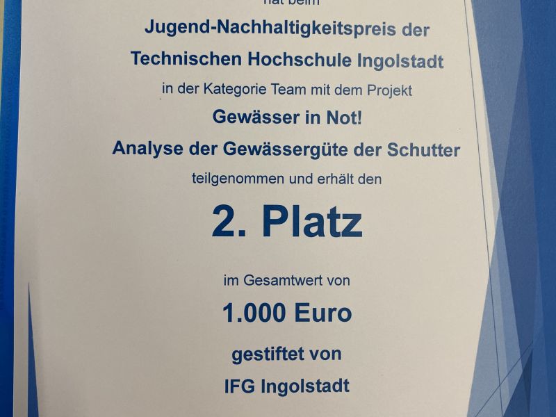 Einen beeindruckenden, mit einem Preisgeld von 1000 Euro dotierten 2. Platz erzielten die beiden Brüder mit ihrem Beitrag "Gewässer in Not - Analyse der Gewässergüte der Schutter".