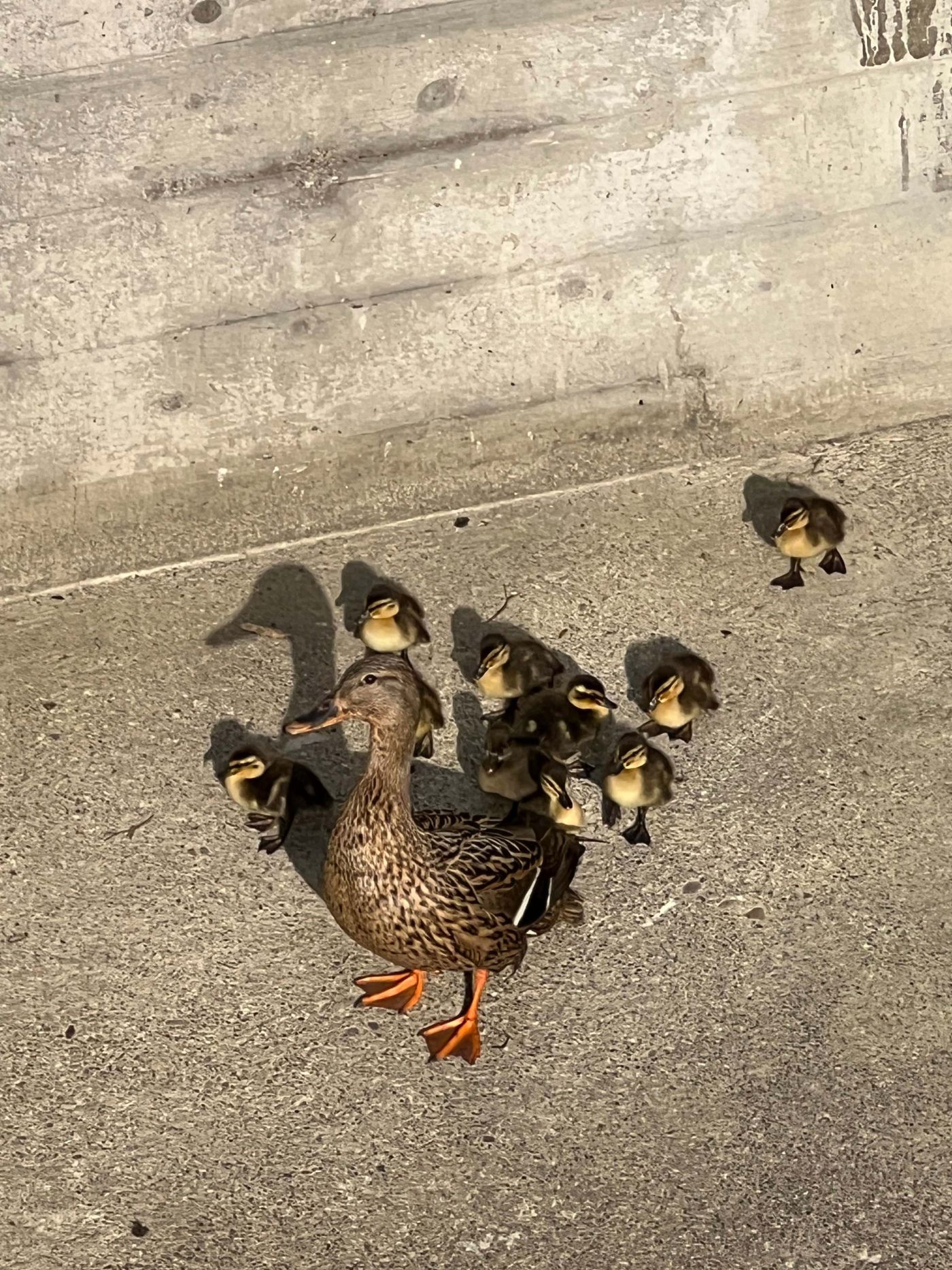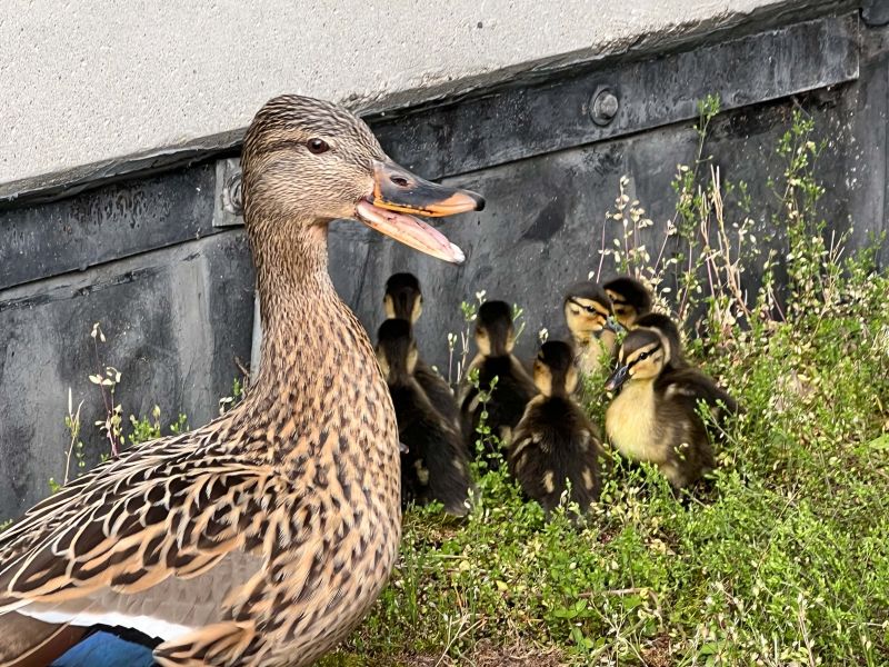 Die weibliche Stockente harrte bei Wind und Regen auf ihrem Nest aus, um die Eier zu wärmen. Nach dem Schlupf werden Entenküken von ihrer Mutter an das nächstgelegene Gewässer geführt – doch wie sollten sie vom Dach gelangen? Fliegen können die Küken ja noch nicht! Hier kam die tatkräftige Unterstützung unseres Hausmeisters ins Spiel: Damit die Kleinen nicht den Stadtkrähen zum Opfer fallen, hat unser Hausmeister sie eingesammelt und im Schulhof ausgesetzt, wo die lautstark piependen Energiebündel alsbald wieder mit ihrer Entenmutter vereint waren, die sich dann auch umgehend mit ihrem Nachwuchs Richtung Künette-Graben in Bewegung setzte.