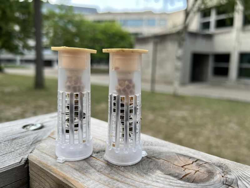 In jedem der beiden Röhrchen auf dem Bild befindet sich eine frisch geschlüpfte Bienenkönigin mit einigen Ammenbienen. Diese setzen wir jetzt jeweils in einem Kunstschwarm zu und hoffen dann, dass beim Hochzeitsflug nichts schief geht, sodass wir dann neben den fünf bisherigen Ablegern am Katherl ein weiteres Bienenvolk überwintern können.