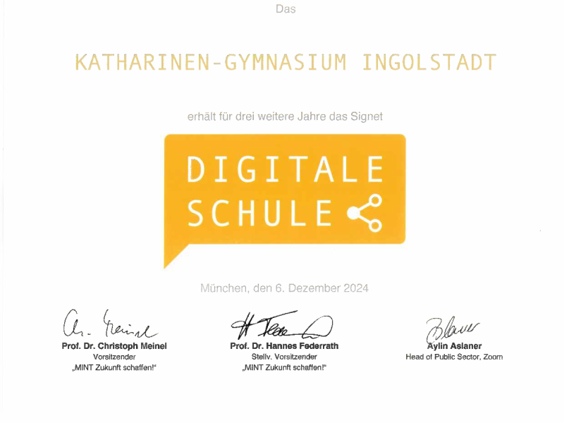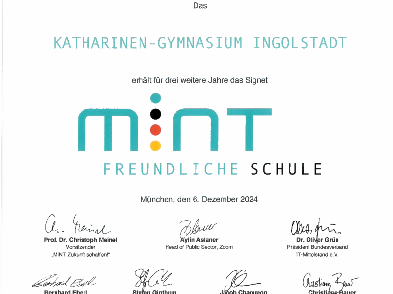 Am 6. Dezember 2024 erhielten 50 Schulen aus Bayern den Titel “Digitale Schule” und 86 Schulen den Titel “MINT-freundliche Schule”. Die Schulen wurden heute in den Münchner Räumen von Google Deutschland geehrt. Das Katherl wurde erneut in beiden Bereichen geehrt.
