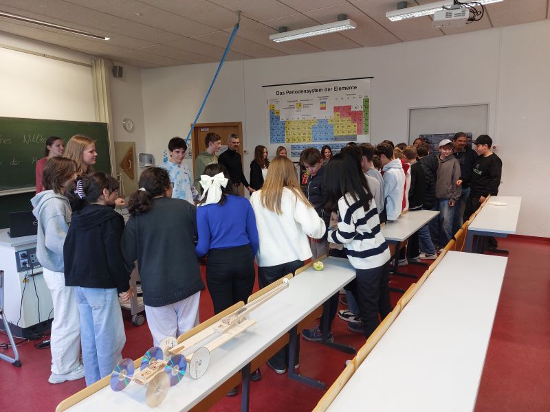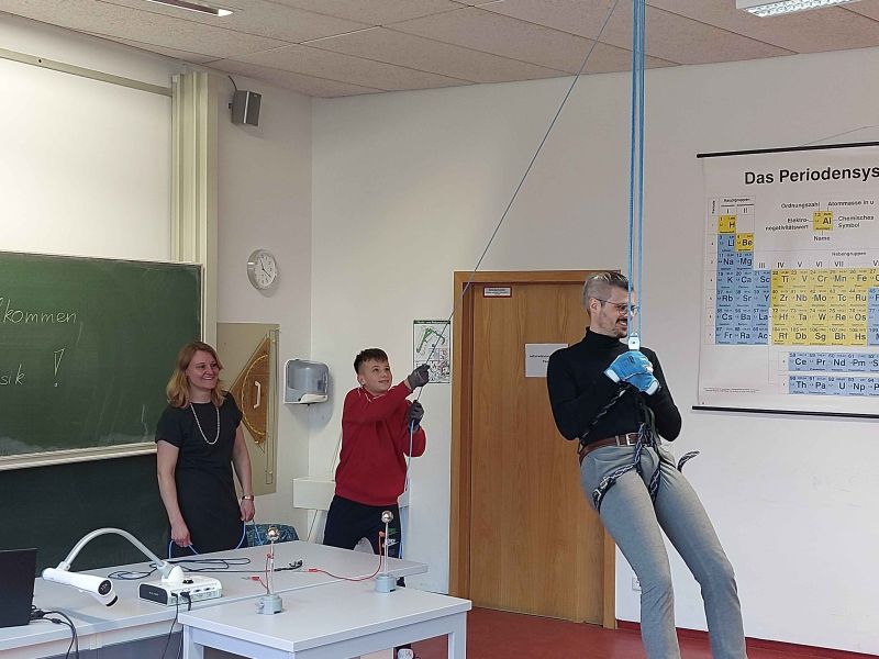 Am Mittwoch, den 20. März 2024 hatten die Schülerinnen und Schüler der 7. Klassen die Gelegenheit, sich über den Naturwissenschaftlichen Zweig zu informieren und ein paar spannenden physikalischen und chemischen Experimenten beizuwohnen bzw. dort auch selbst mitzumachen: Beispielsweise hieß es: „Zieh den Physik-Lehrer per Flaschenzug selbst an die Decke“ oder „Schließe den Kreis mit deinen Mitschülerinnen und Mitschülern per Handschlag und lasse so ein Lied aus dem Lautsprecher erklingen“.