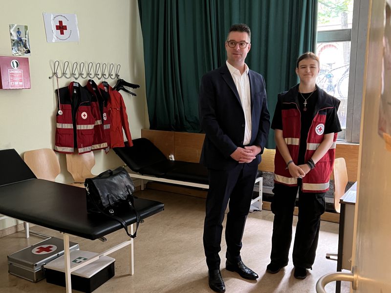 Im Anschluss an die Spendenübergabe informierte Miriam Köhnlein den Kulturreferenten über die Tatigkeit des Schulsanitätsdienstes am Katherl.