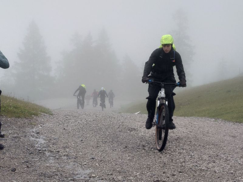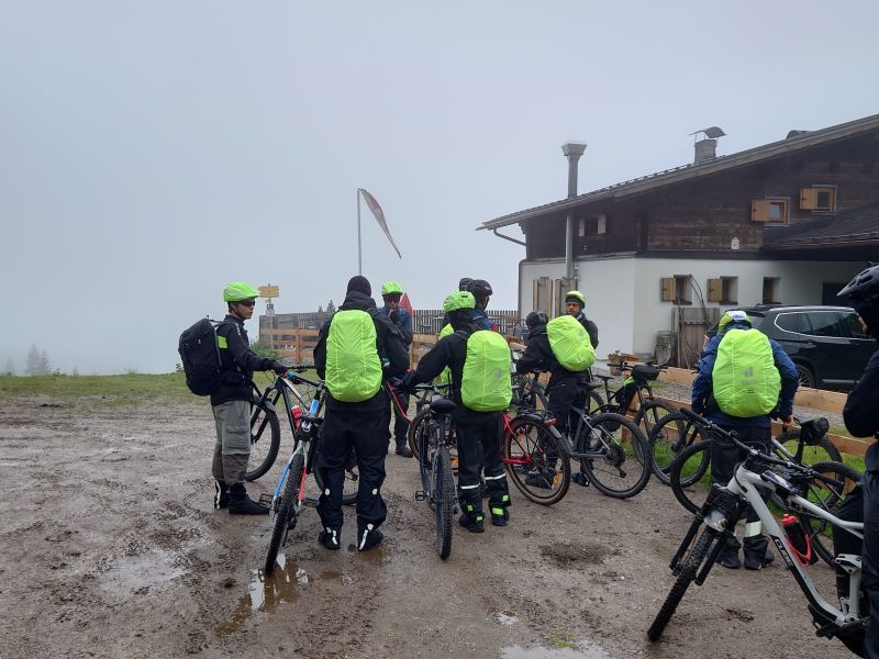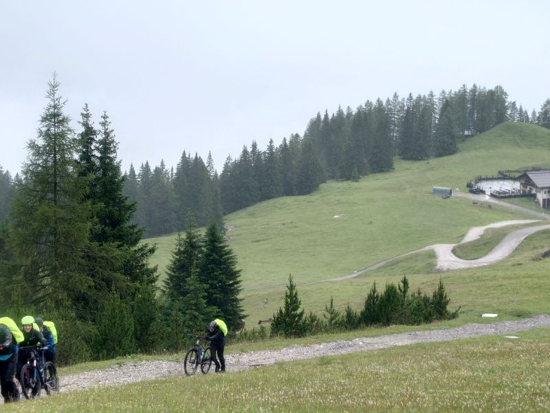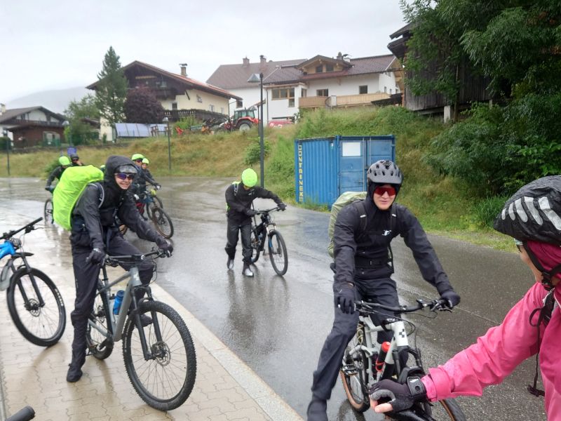 Somit kleideten wir uns alle mit unseren Regenklamotten ein und los ging es. Hauptsächlich bezwangen wir steile Schotterwege und kämpften uns die Serpentinen nach oben bis zur Sunnalm hoch über dem Fernpass. Dort angekommen trockneten wir unsere Klamotten, die trotz Abweisfunktion klitschnass waren.