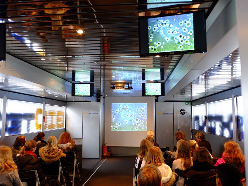 Mit Veranstaltungen wie Praktika, geführten Ausstellungsrundgängen, Vorträgen oder der „Offenen Tür” richtet sich die Initiative „BIOTechnikum” vor allem an Schülerinnen und Schüler, den wissenschaftlichen Nachwuchs und die breite Öffentlichkeit. Die Bilder wurden gemacht, als die mobile Erlebniswelt am 9. und 10.01.2014 am Katharinen-Gymnasium Ingolstadt Station machte.